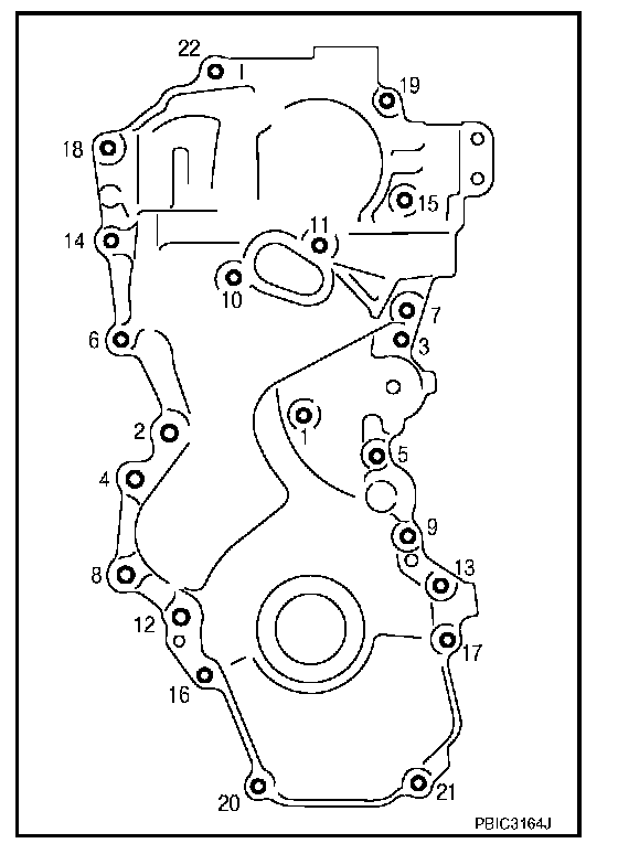 Install front cover, and tighten bolts in numerical order as shown.