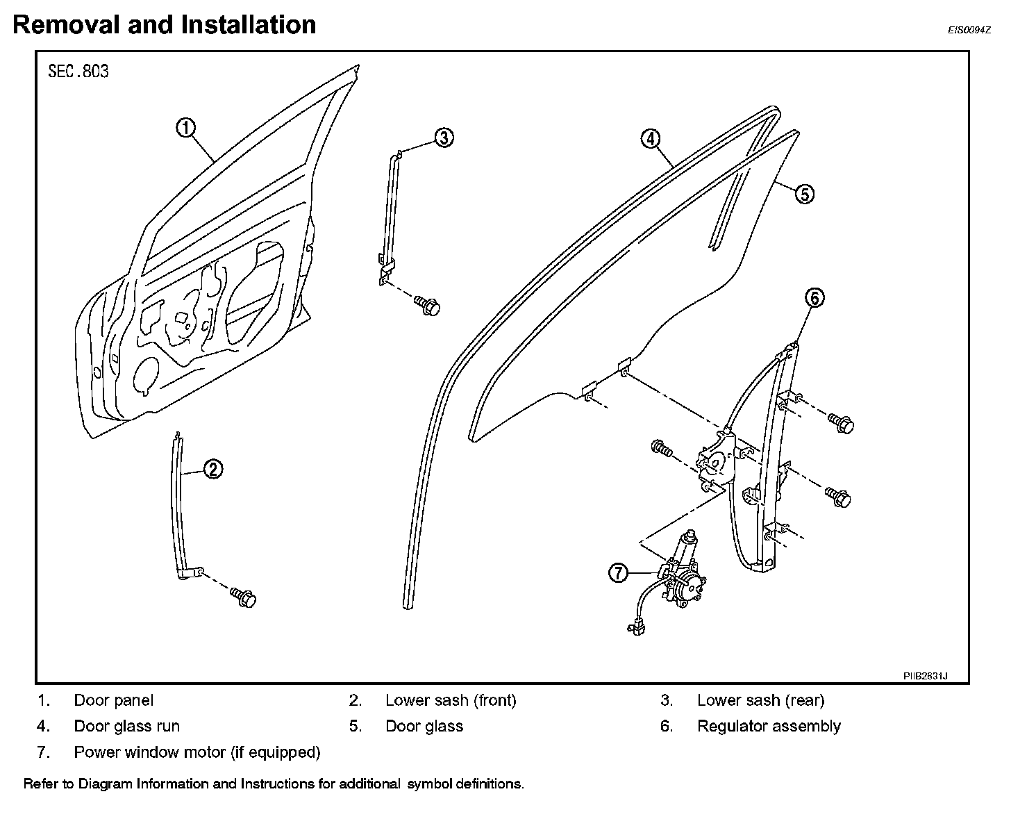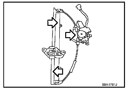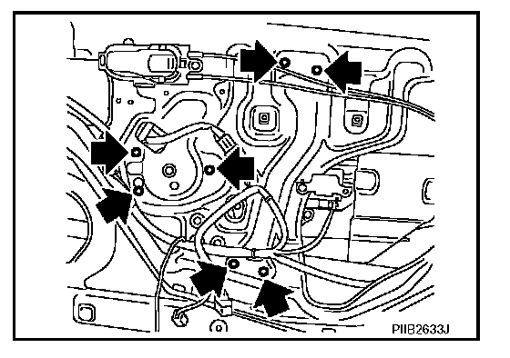 7. Remove the door glass bolts, and then remove the regulator assembly.