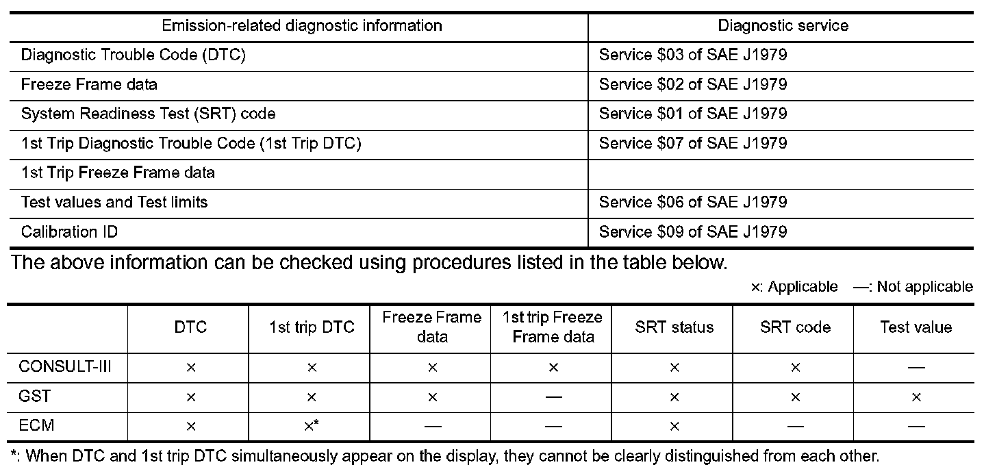 The malfunction indicator lamp (MIL) on the instrument panel lights up when the same malfunction is detected in two consecutive trips (Two trip detection logic), or when the ECM enters fail-safe mode. (Refer to EC-85, "Fail-Safe Chart".) Fail-Safe Chart