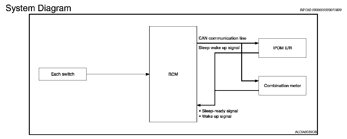 - Each unit starts the transmission of CAN communication with the sleep wake up signal. In addition, the combination meter transmits the wake up signal to BCM via CAN communication to report the CAN communication start.
