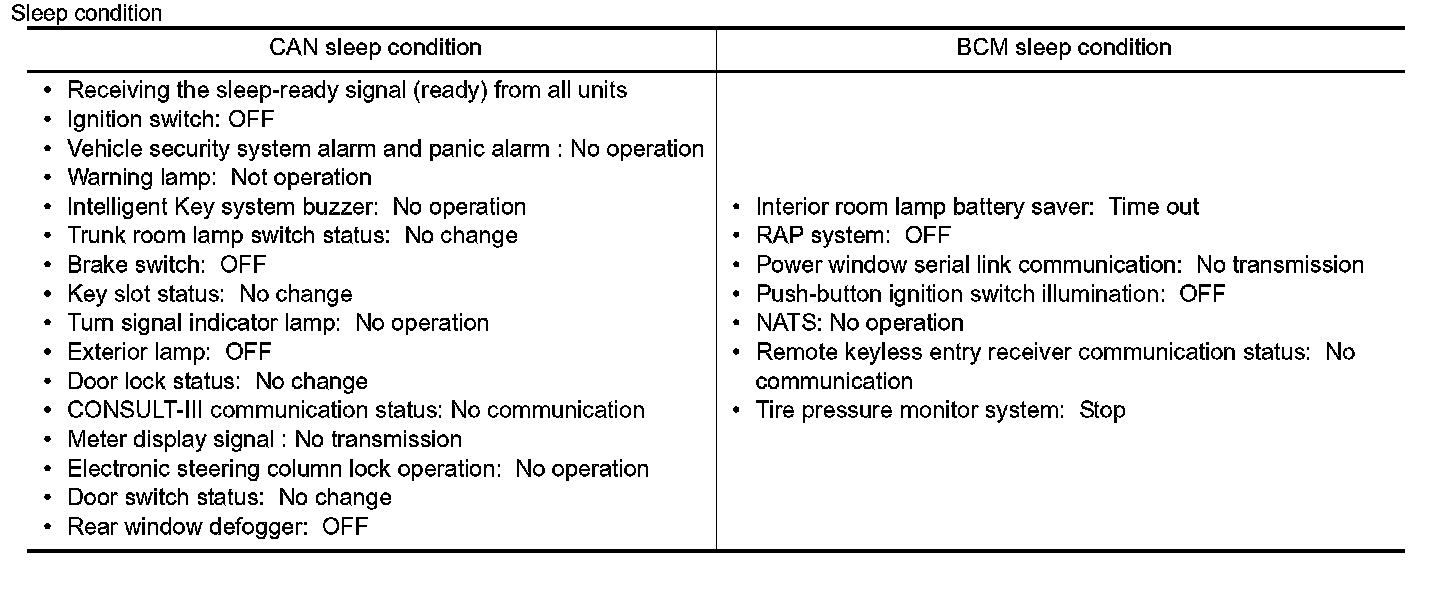 - BCM transmits the sleep wake up signal (sleep) to each unit when all of the CAN sleep conditions are fulfilled.