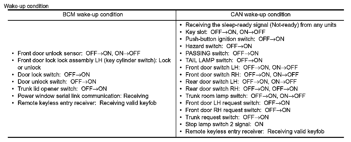 - BCM transmits the sleep wake up signal (wake up) to each unit when any of the CAN wake-up conditions is fulfilled. It changes from the low power consumption mode or the CAN communication sleep mode to the normal mode.