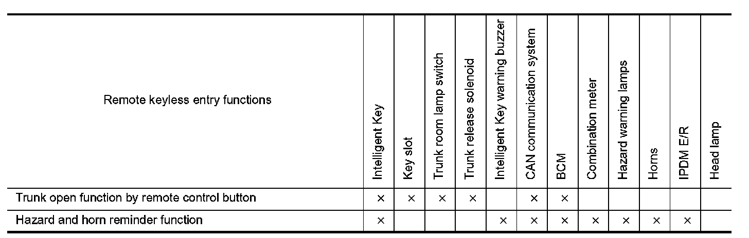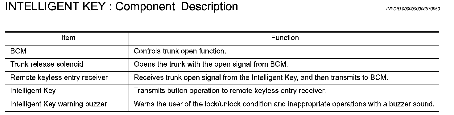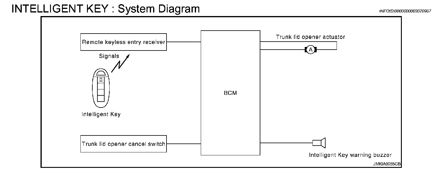 - When trunk button of the Intelligent Key is pressed, the trunk open signal is transmitted from the Intelligent Key to the BCM via remote keyless entry receiver.
