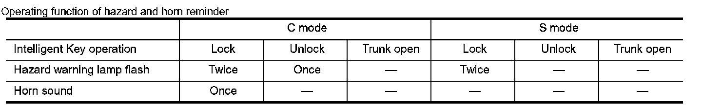 When doors are locked or unlocked by Intelligent Key. BCM flashes hazard warning lamps as a reminder and transmits horn chirp signal to IPDM E/R. IPDM E/R sound horns as a reminder. The hazard and horn reminder has a horn chirp mode (C mode) and a non-horn chirp mode (S mode).