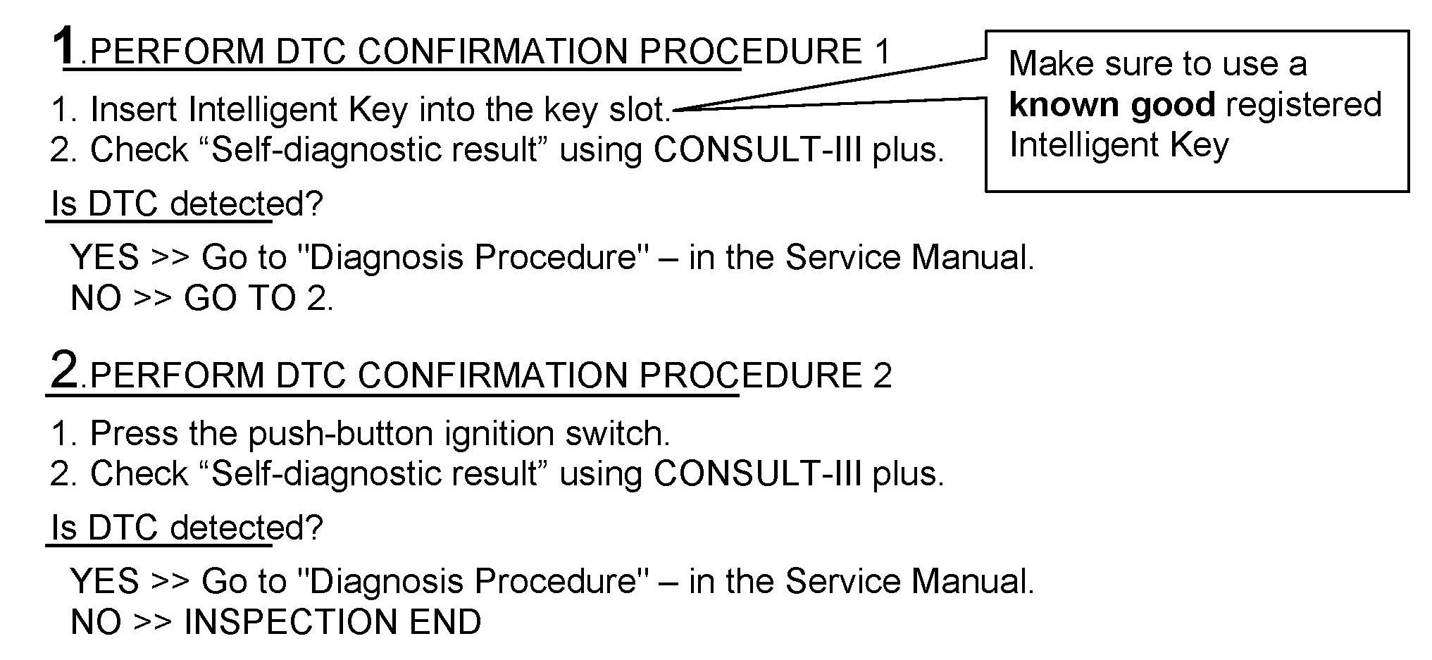 If DTC B2190 is stored due to 1 or 2 above, it will not erase, or go to "PAST", until a known good registered Intelligent Key is inserted into the Key-Slot.