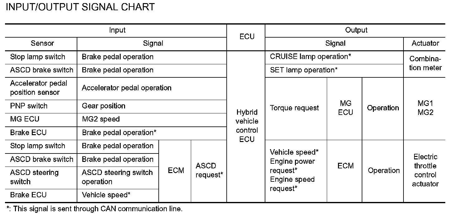 The hybrid vehicle control ECU receives signals from each switch, sensor, control unit, and maintains constant vehicle speed by optimizing the use of the engine and motor driving force.