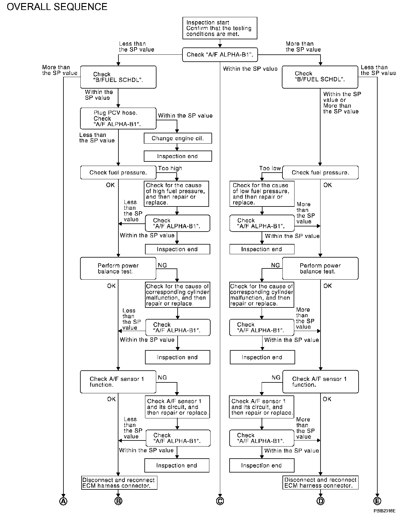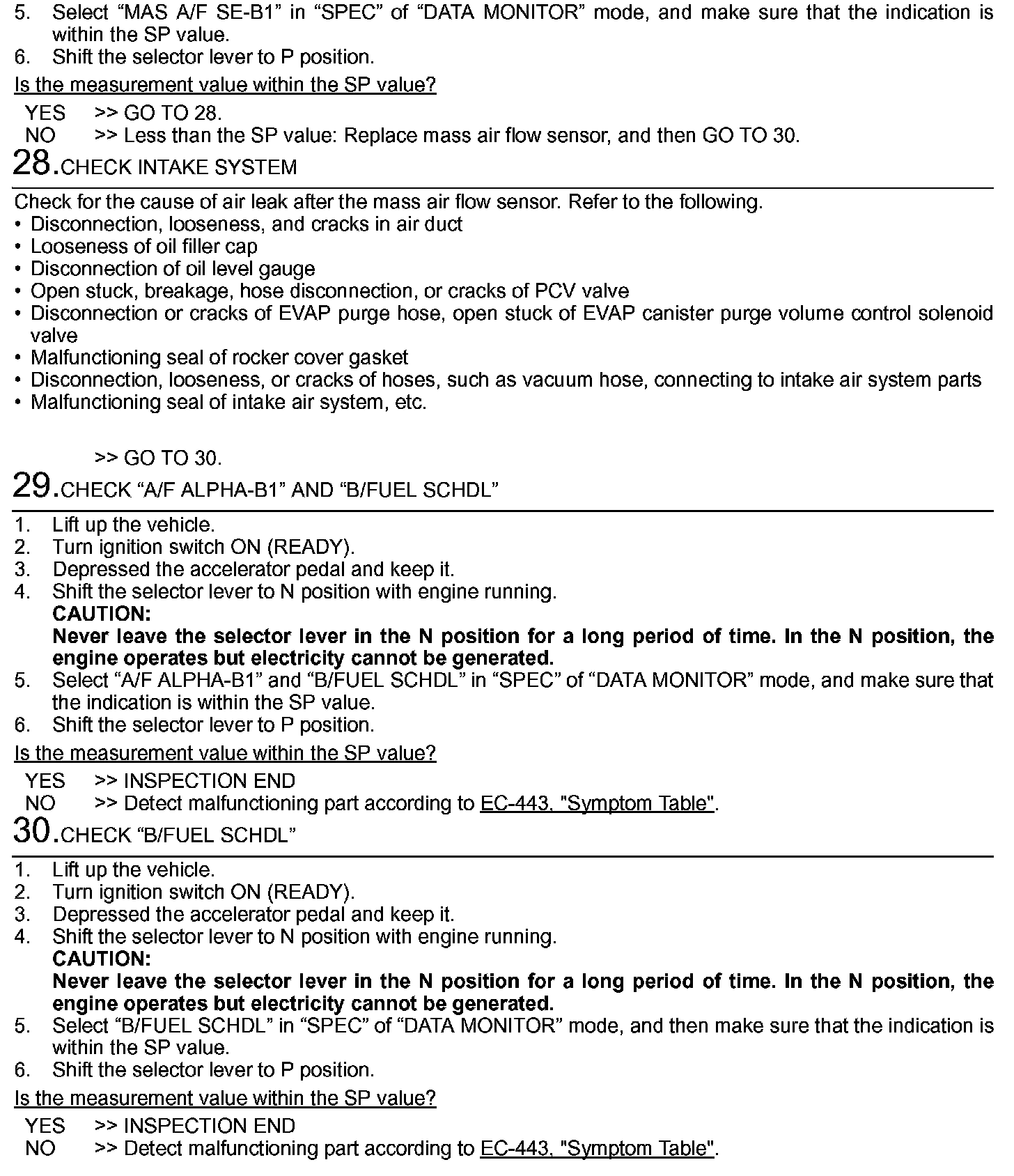 The specification (SP) value indicates the tolerance of the value that is displayed in "SPEC" of "DATA MONITOR" mode of CONSULT-III during normal operation of the Engine Control System. When the value in "SPEC" of "DATA MONITOR" mode is within the SP value, the Engine Control System is confirmed OK. When the value in "SPEC"of "DATA MONITOR" mode is NOT within the SP value, the Engine Control System may have one or more malfunctions.