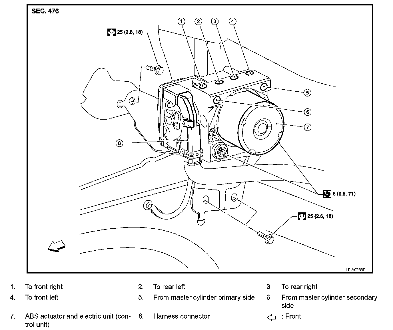 2. Loosen brake tube flare nuts, then remove brake tubes from ABS actuator and electric unit (control unit).
