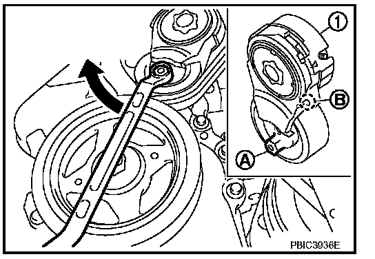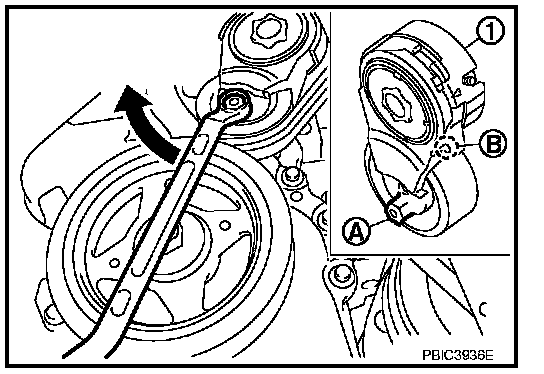 1. Hold the hexagonal part (A) of drive belt auto-tensioner (1) with a wrench securely. Then move the wrench handle in the direction of arrow (loosening direction of tensioner).