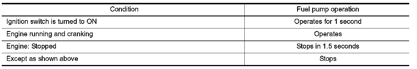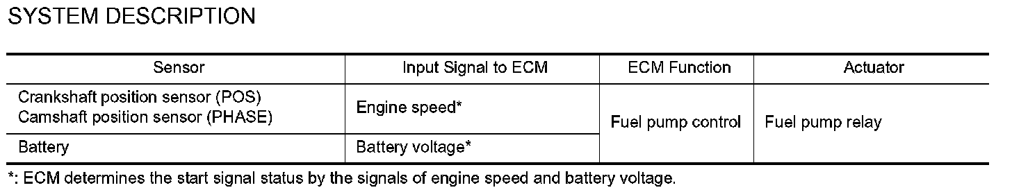 The ECM activates the fuel pump for several seconds after the ignition switch is turned ON to improve engine startability. If the ECM receives a engine speed signal from the crankshaft position sensor (POS) and camshaft position sensor (PHASE), it knows that the engine is rotating, and causes the pump to operate. If the engine speed signal is not received when the ignition switch is ON, the engine stalls. The ECM stops pump operation and prevents battery discharging, thereby improving safety. The ECM does not directly drive the fuel pump. It controls the ON/OFF fuel pump relay, which in turn controls the fuel pump.