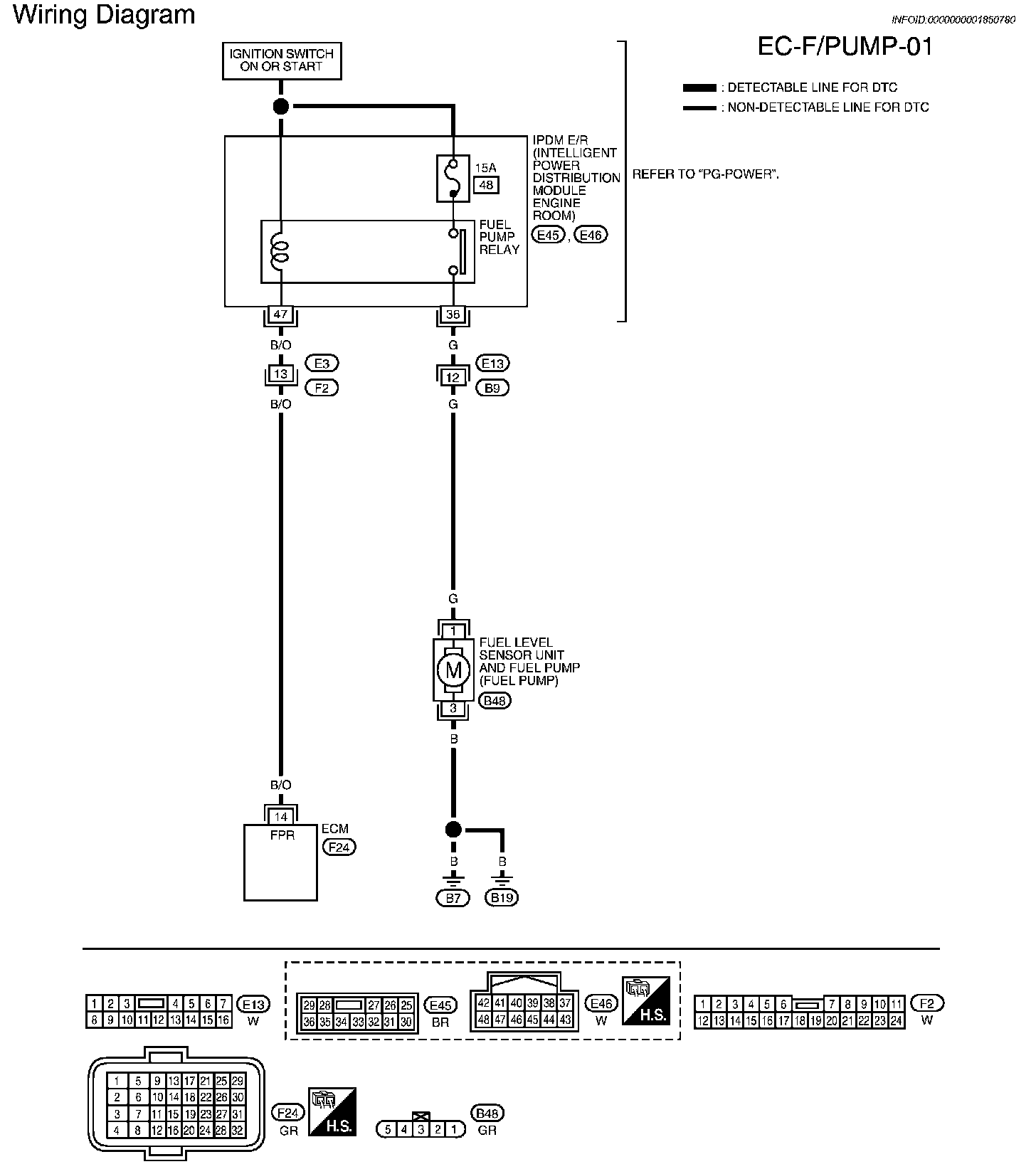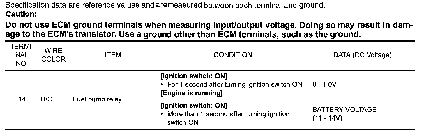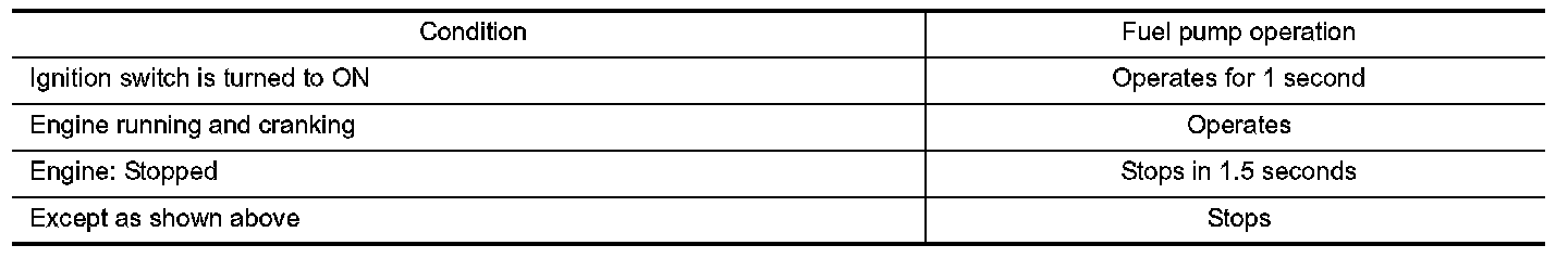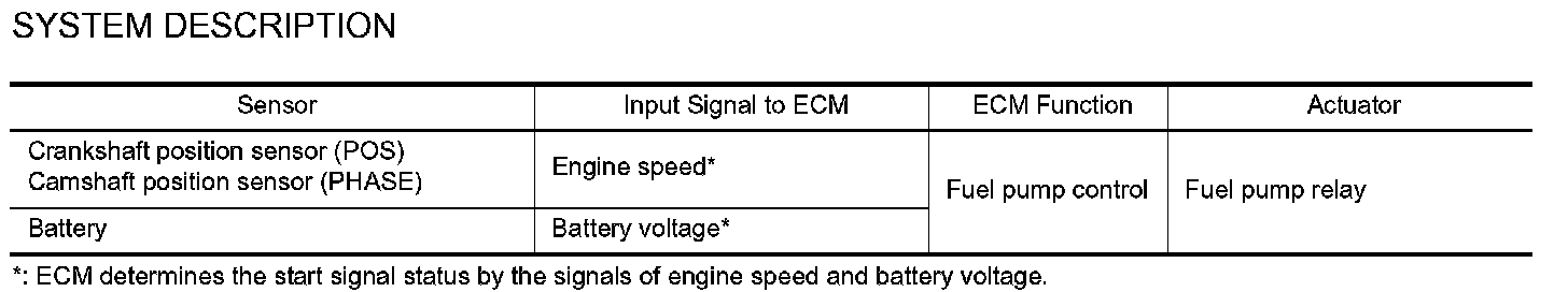 The ECM activates the fuel pump for several seconds after the ignition switch is turned ON to improve engine startability. If the ECM receives a engine speed signal from the crankshaft position sensor (POS) and camshaft position sensor (PHASE), it knows that the engine is rotating, and causes the pump to operate. If the engine speed signal is not received when the ignition switch is ON, the engine stalls. The ECM stops pump operation and prevents battery discharging, thereby improving safety. The ECM does not directly drive the fuel pump. It controls the ON/OFF fuel pump relay, which in turn controls the fuel pump.