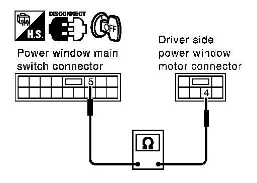 3. Check continuity between power window main switch connector D7 terminal 5 and driver side power window motor connector D9 terminal 4.