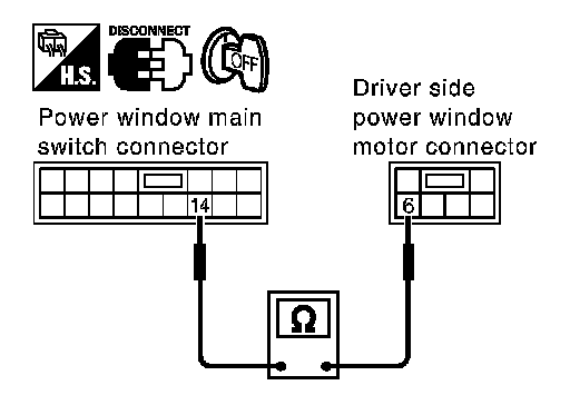 2. Check continuity between power window main switch connector D7 terminal 14 and driver side power window motor connector D9 terminal 6.