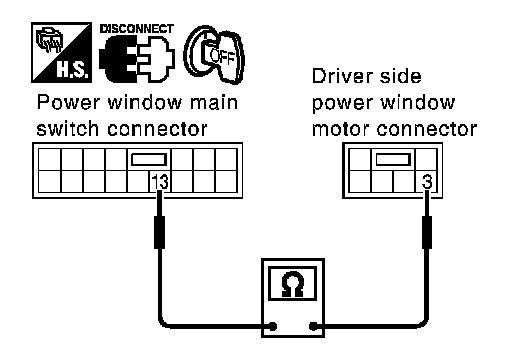 3. Check continuity between power window main switch connector D7 terminal 13 and driver side power window motor connector D9 terminal 3.