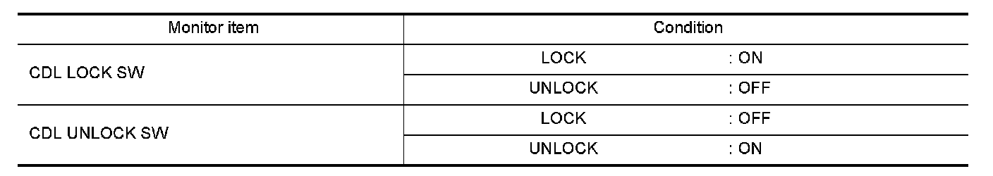 Check ("CDL LOCK SW ", "CDL UNLOCK SW") in "DATA MONITOR" mode for "POWER DOOR LOCK SYSTEM" with CONSULT-III. Refer to Door Lock.