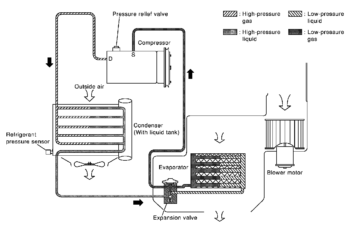 The refrigerant system is protected against excessively high or low pressures by the refrigerant pressure sensor, located on the condenser. If the system pressure rises above or falls below the specifications, the refrigerant pressure sensor detects the pressure inside the refrigerant line and sends the voltage signal to the ECM.