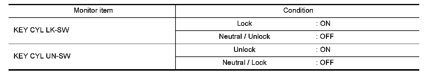 Check KEY CYL UN-SW, KEY CYL UN-SW in "DATA MONITOR" mode for "POWER DOOR LOCK SYSTEM" with CONSULT-III. Refer to Sedan Without Intelligent Key.