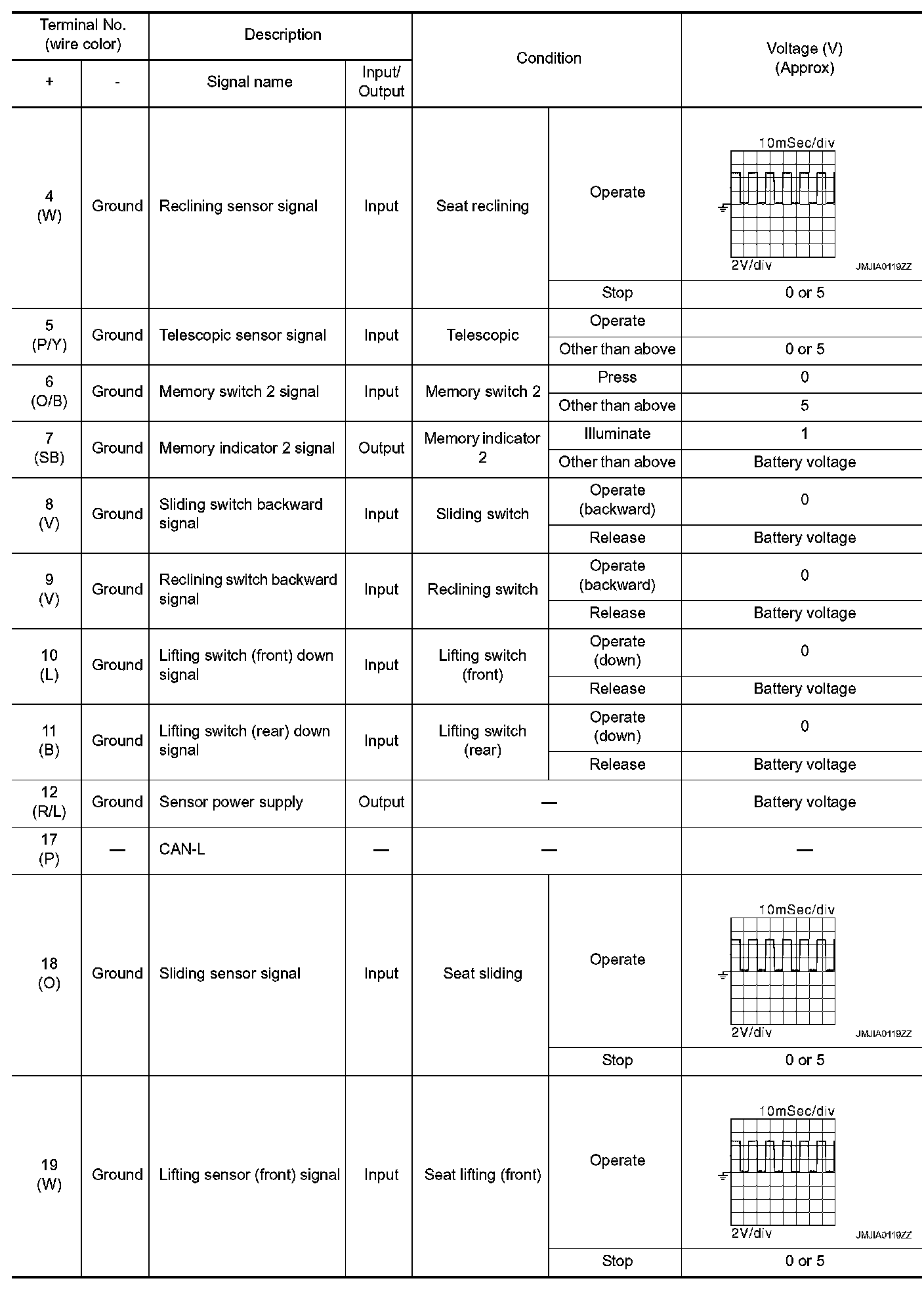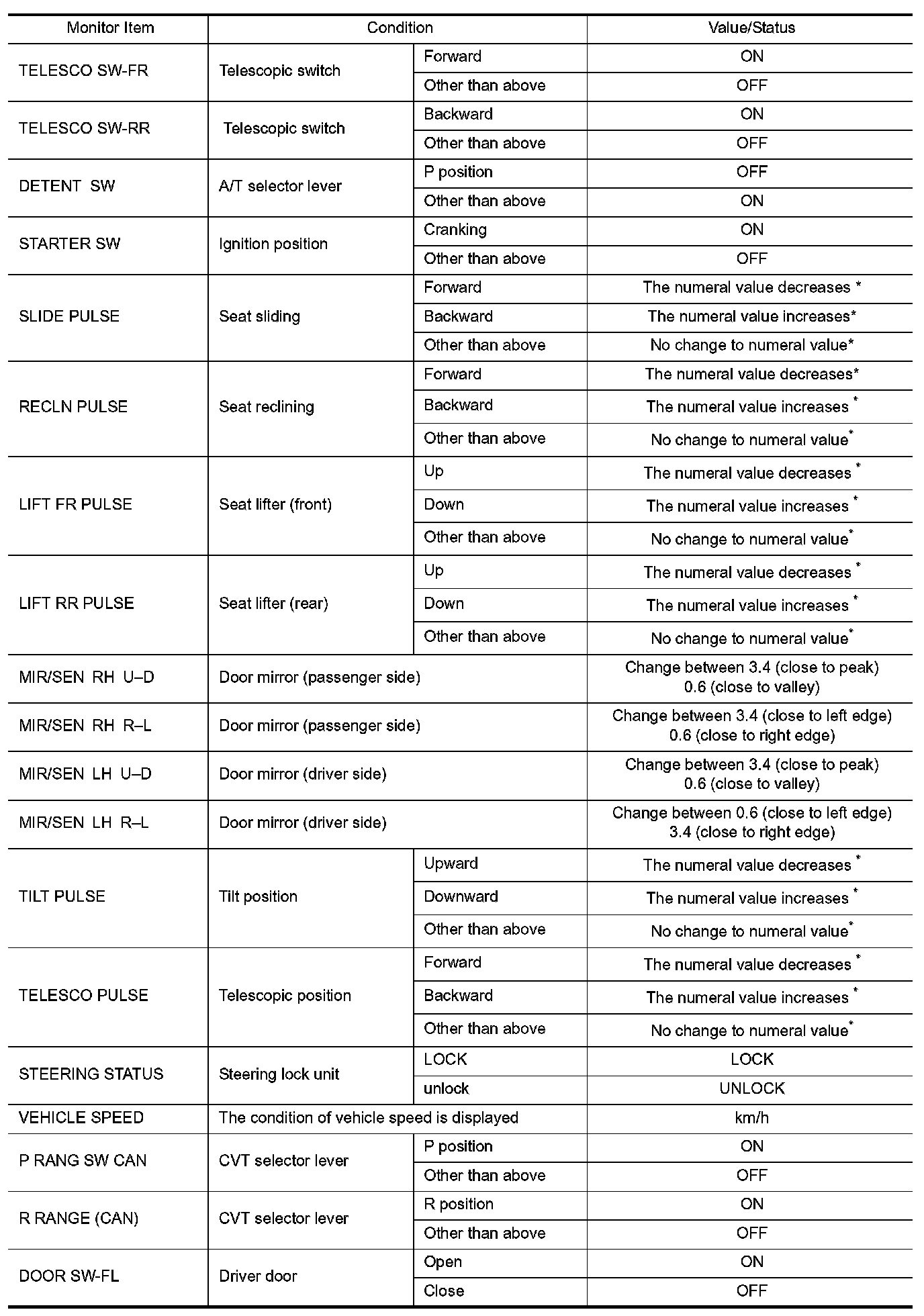 Pinout Values and Diagnostic Parameters
