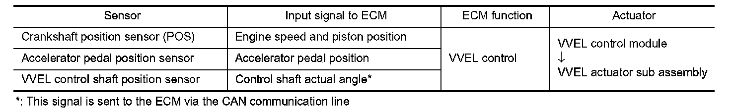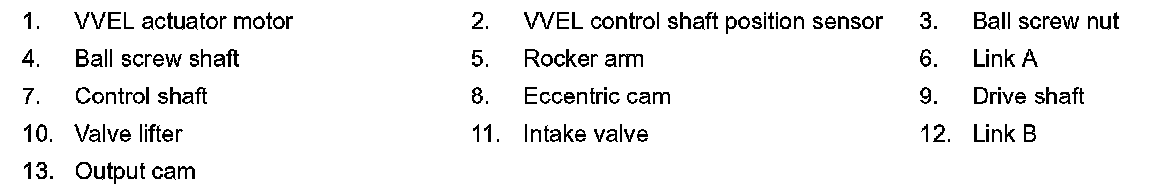 VVEL (Variable Valve Event & Lift) is a system that controls valve event and valve lift continuously. Rotational movement of the drive shaft equipped with eccentric cam is transmitted to output cam via the rocker arm and two kinds of links to depress the intake valve. ECM decides the target valve lift according to the driving condition and sends the command signal to the VVEL control module. The VVEL control module controls the rotation of the control shaft using the VVEL actuator motor and changes the movement of the output cam by shifting the link supporting point. As a result, valve lift changes continuously to improve engine output and response.