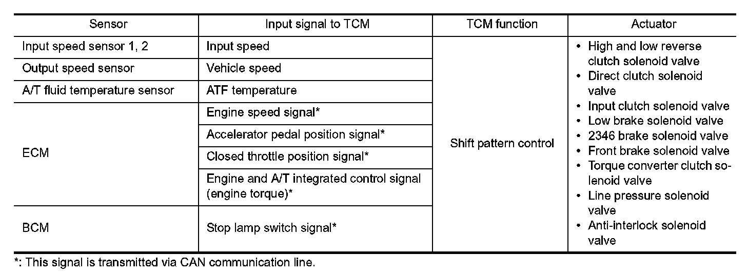 TCM judges up/down slope according to engine torque data transmitted from the ECM and vehicle speed. Fixing at 4GR, 5GR or 6GR on an up-slope prevents shift hunting and controls the vehicle to gain optimum driving force. On a down-slope, automatic shift-down to 4GR, 5GR or 6GR controls to gain optimum engine brake.
