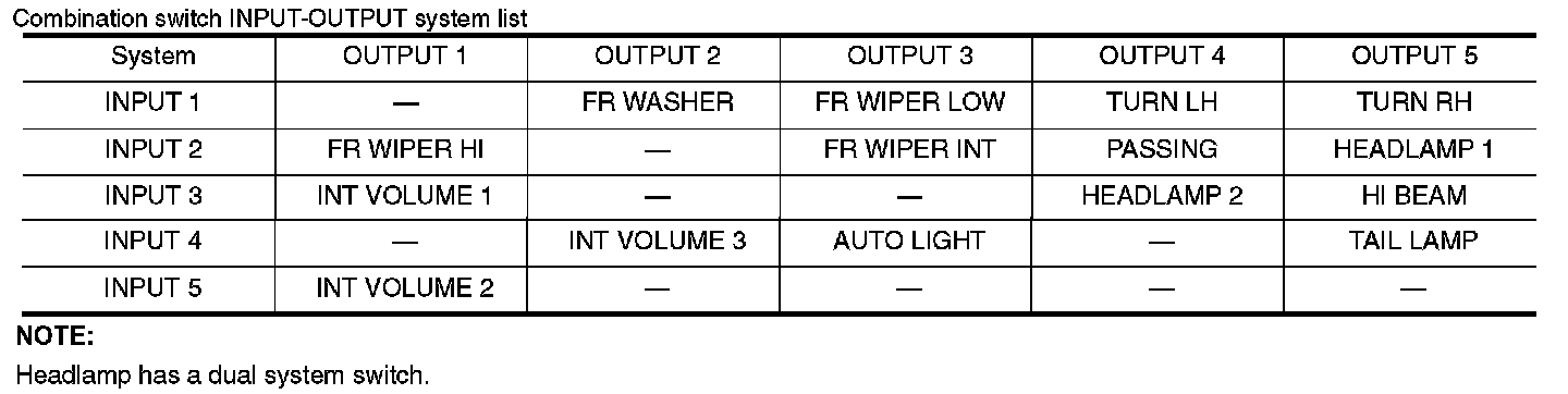 - BCM detects the combination switch status signal "1CE" when the signals of OUTPUT 3 and OUTPUT 5 are input to INPUT 1.