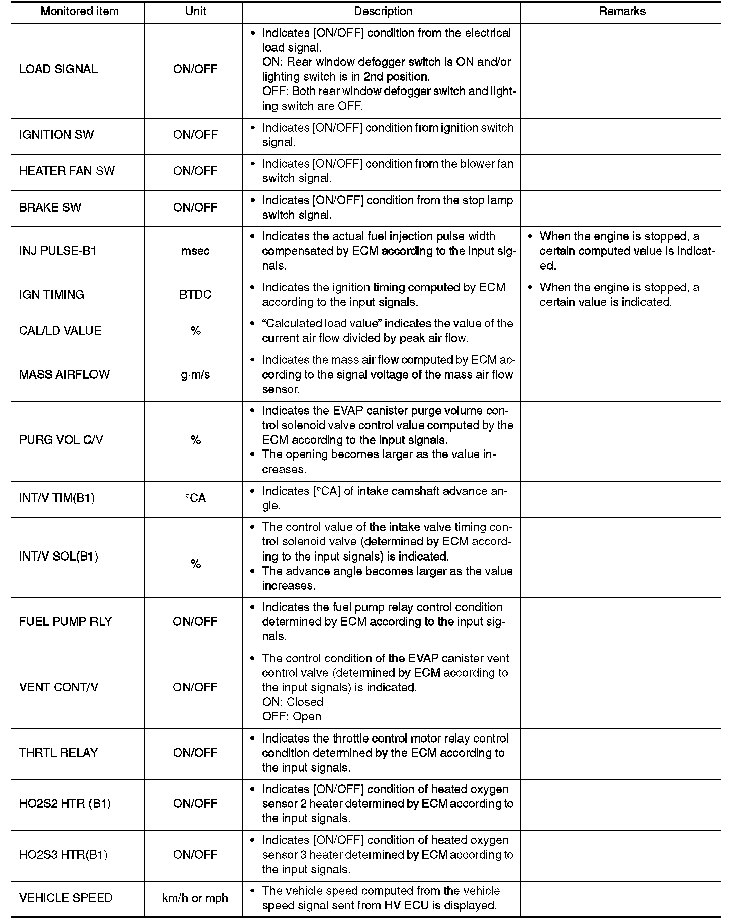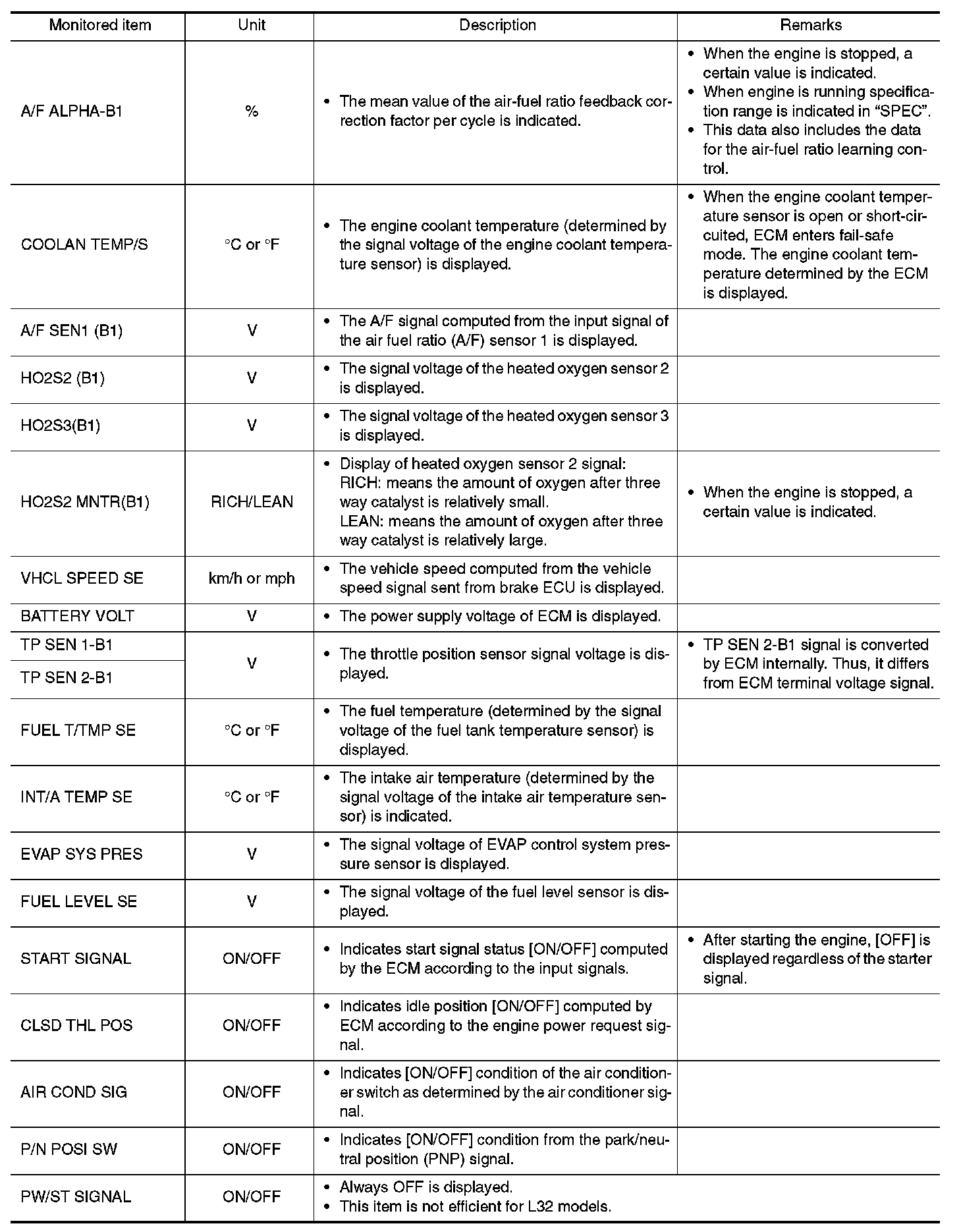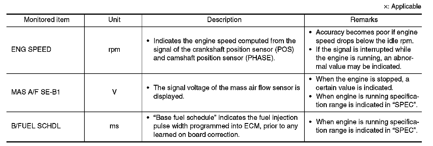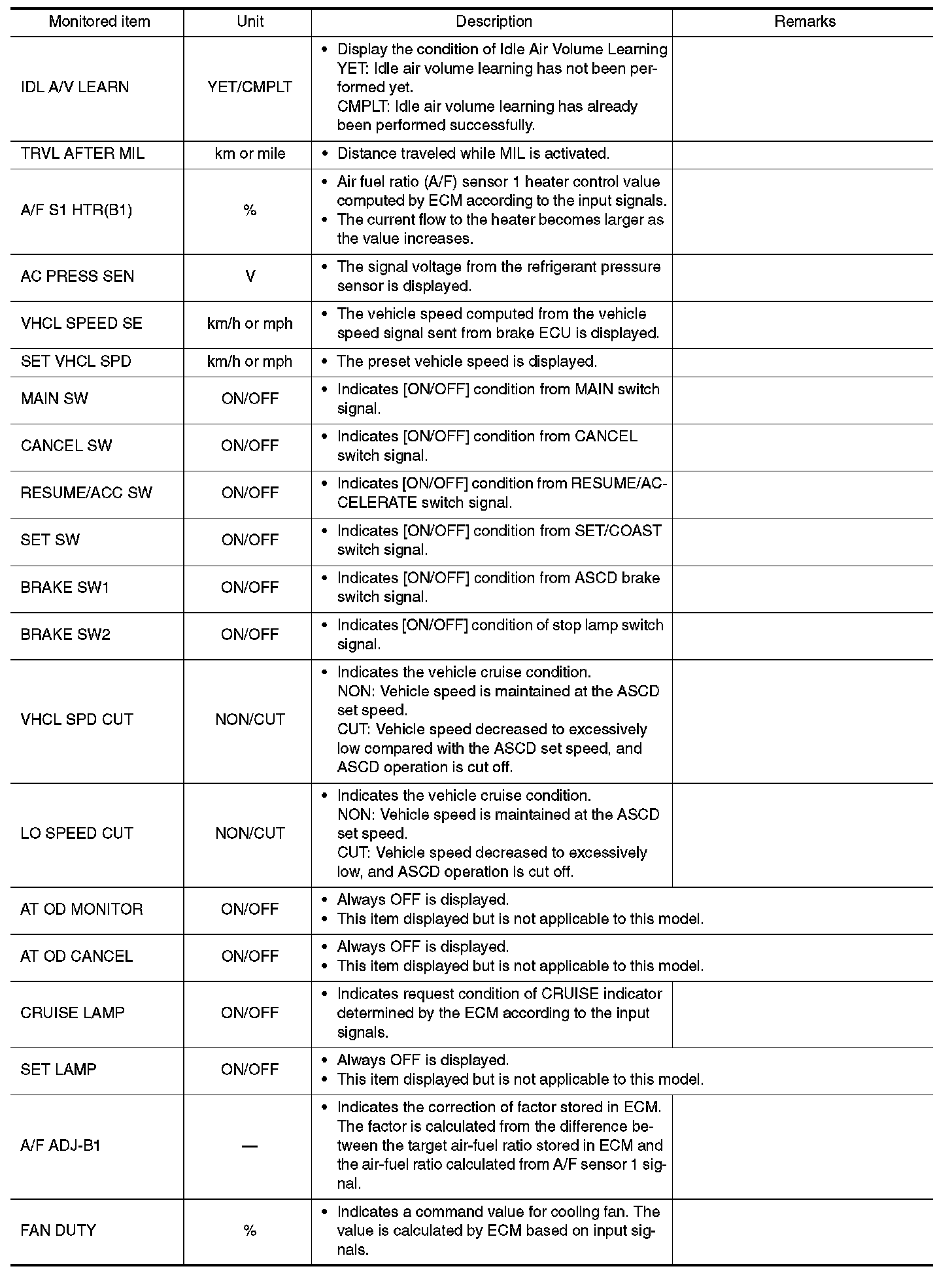 Any monitored item that does not match the vehicle being diagnosed is deleted from the display automatically.