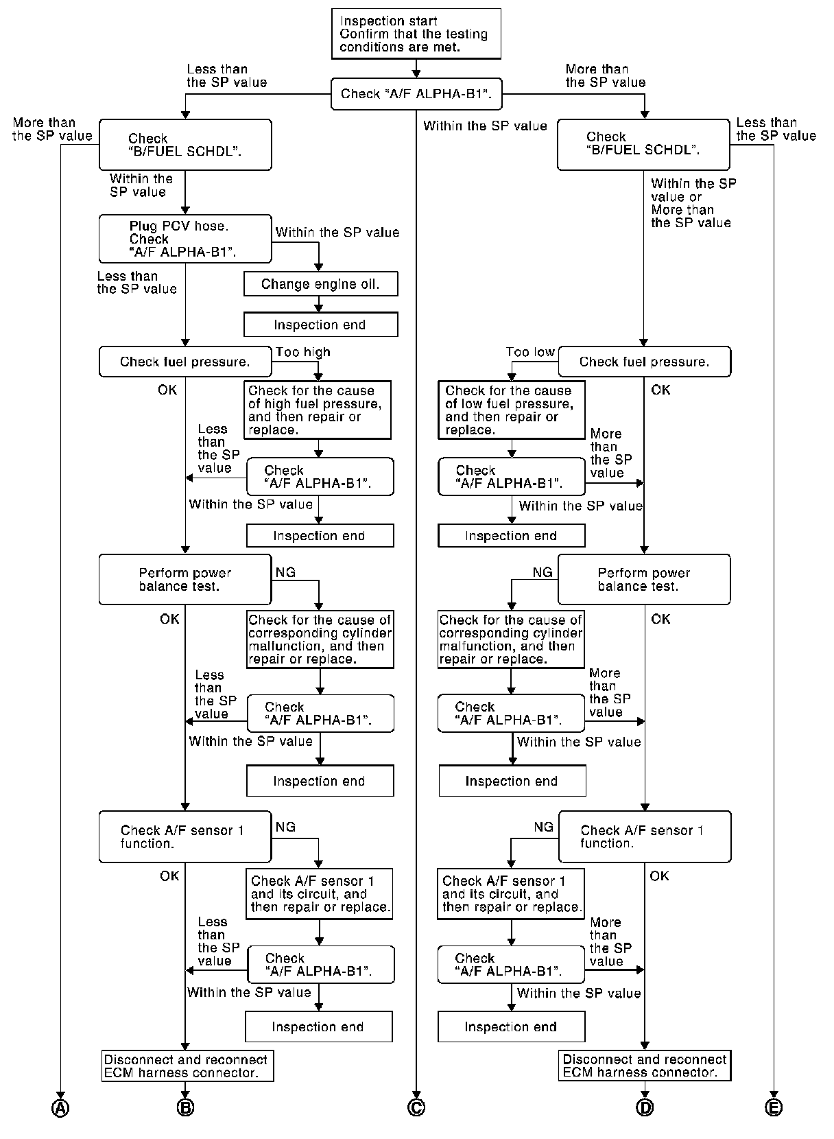 Check "A/F ALPHA-B1" for approximately 1 minute because they may fluctuate. It is NG if the indication is out of the SP value even a little.