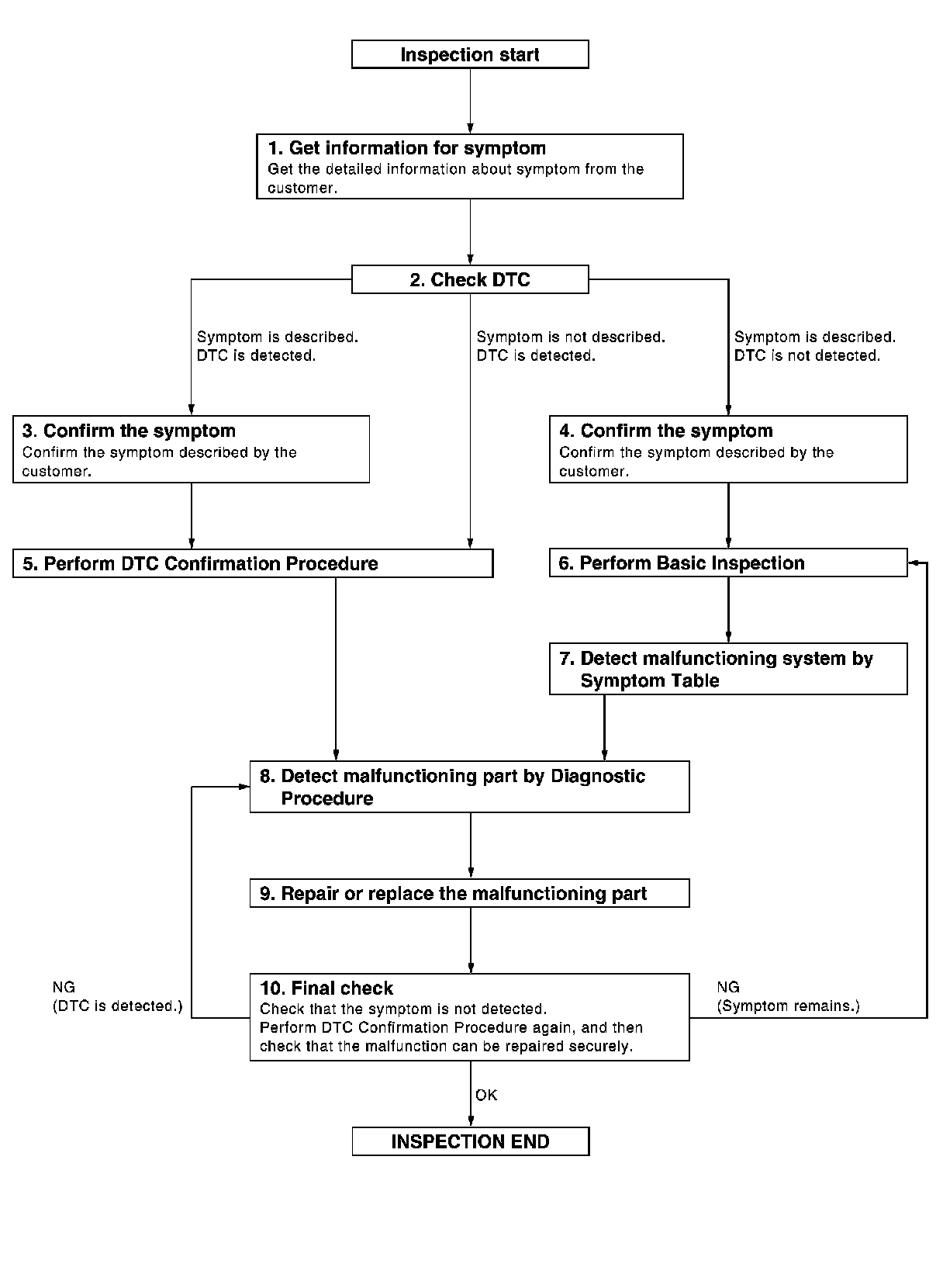 Detect malfunctioning system according to System Description based on the confirmed symptom in step 4, and determine the trouble diagnosis order based on possible causes and symptom.