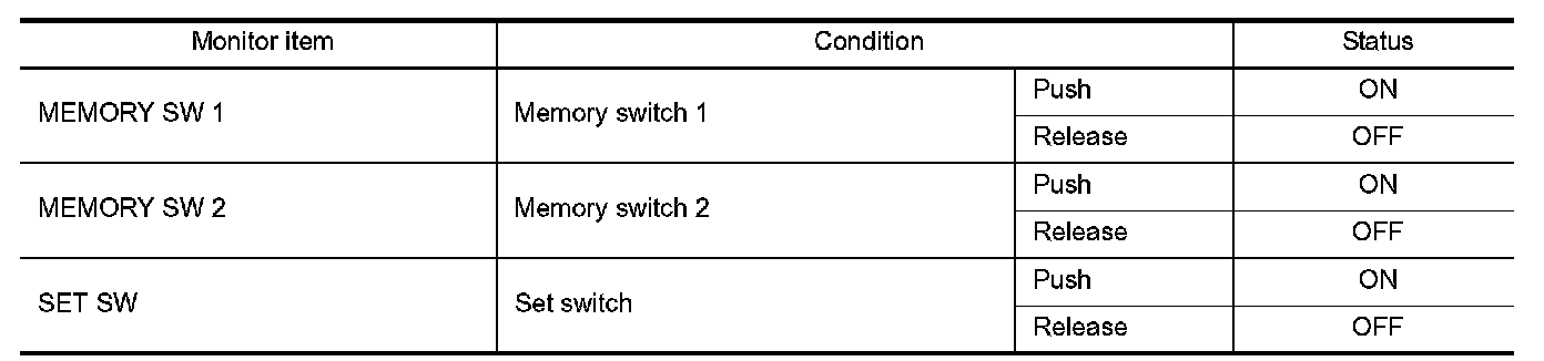 2. Check seat memory switch signal under the following conditions.