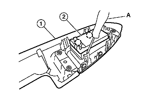 2. Release the pawls on each side with suitable tool (A), then separate the rear power window switch (2) from the finisher (1) and remove.