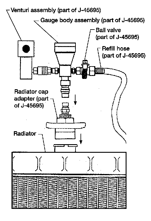 4. Install the Tool by installing the radiator cap adapter onto the radiator neck opening. Then attach the gauge body assembly with the refill tube and the venturi assembly to the radiator cap adapter.
