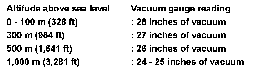 8. Continue to draw the vacuum until the gauge reaches 28 inches of vacuum. The gauge may not reach 28 inches in high altitude locations, use the vacuum specifications below based on the altitude above sea level.