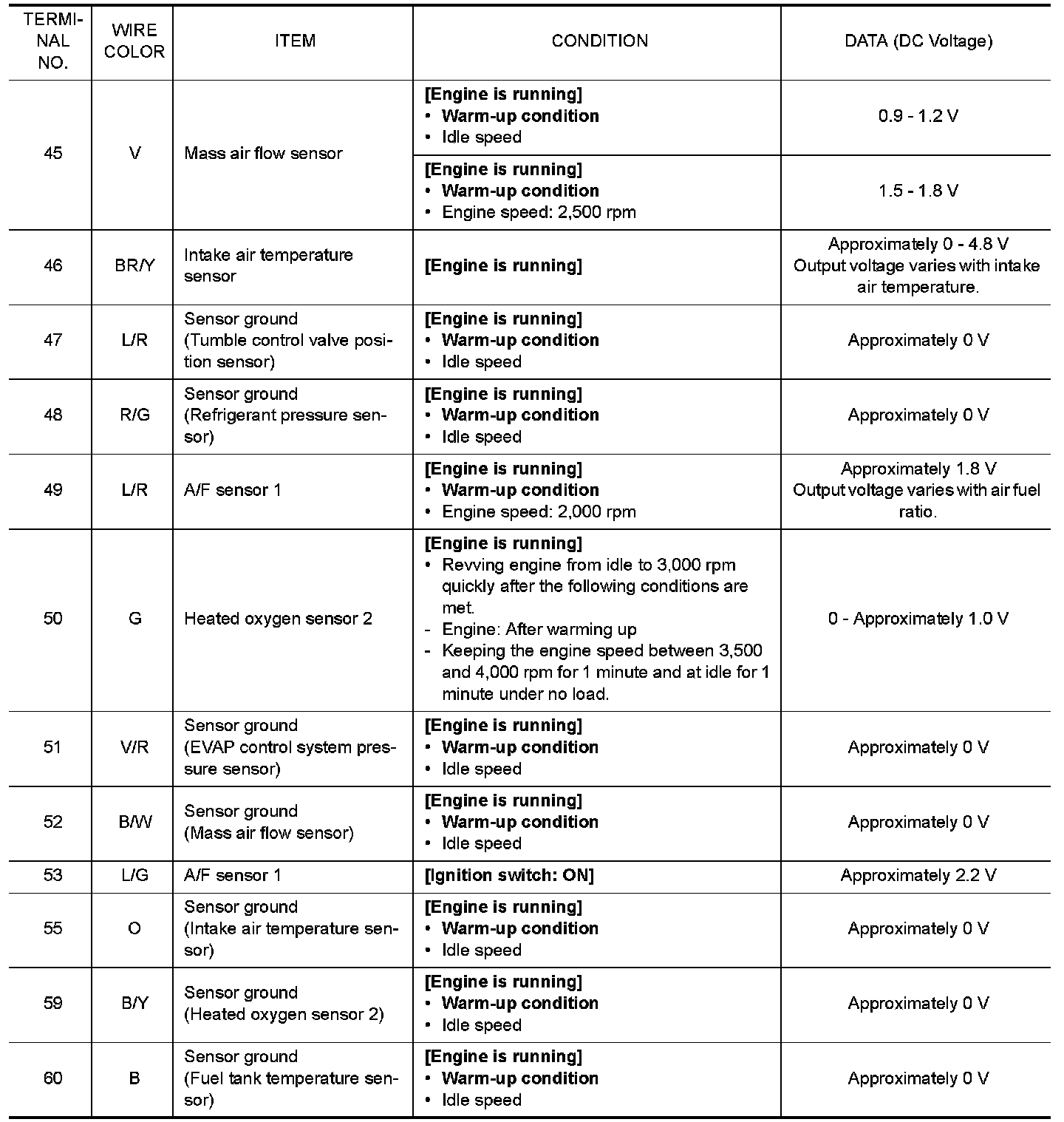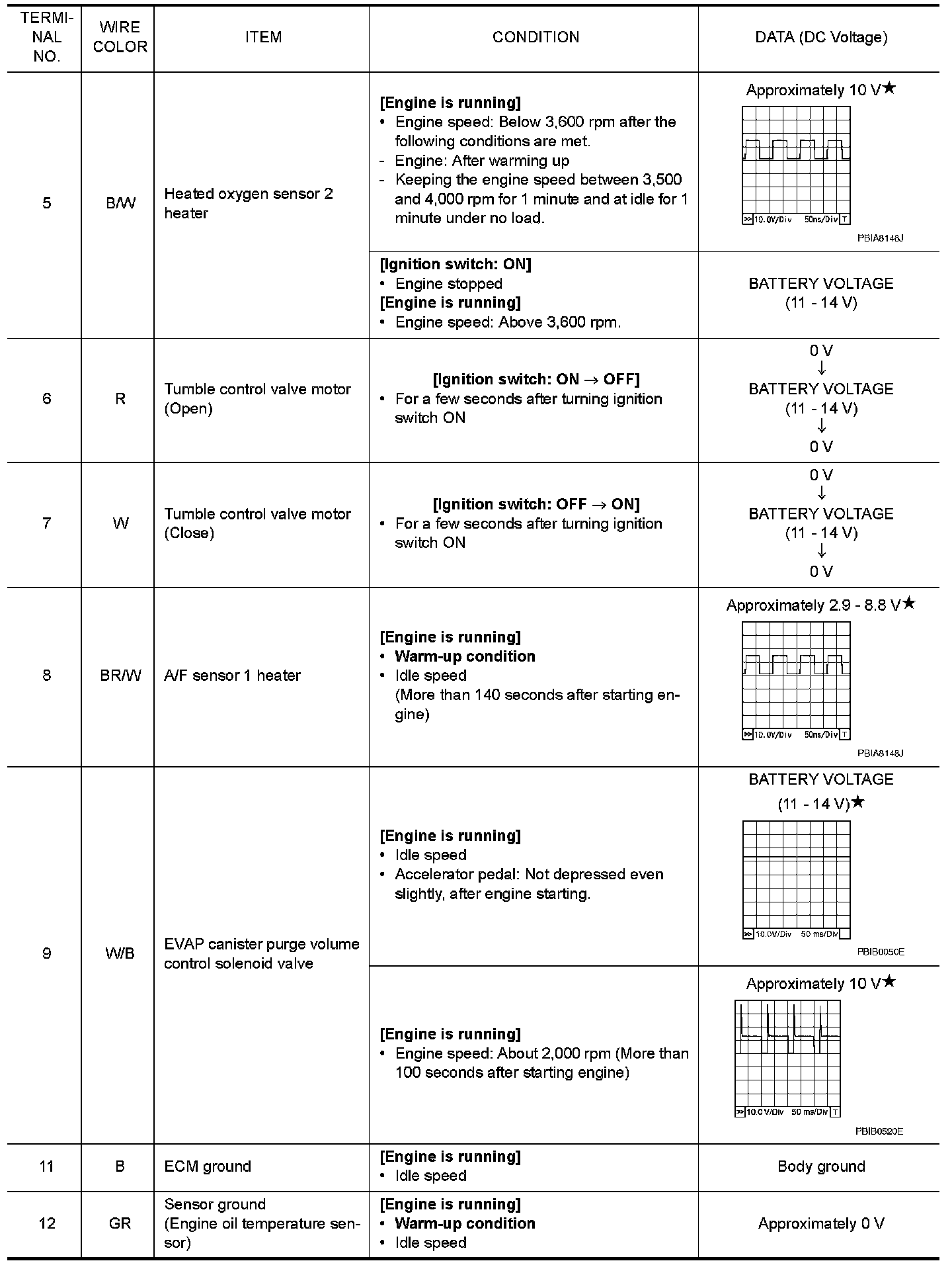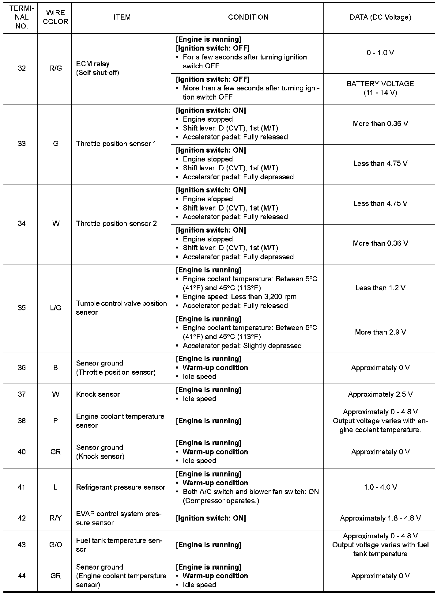 Do not use ECM ground terminals when measuring input/output voltage. Doing so may result in damage to the ECMs transistor. Use a ground other than ECM terminals, such as the ground.