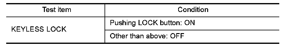 Check keyfob function in "DATA MONITOR" mode with CONSULT-III. When pushing lock button of keyfob, the corresponding monitor item should be turned as follows.