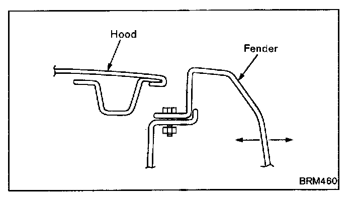 - Adjust the fitting at the front fender mounting position. Tighten the front fender mounting bolts loosely, and adjust the fit by moving the front fender sideways or in the up-down direction while observing the clearance with the hood and door.
