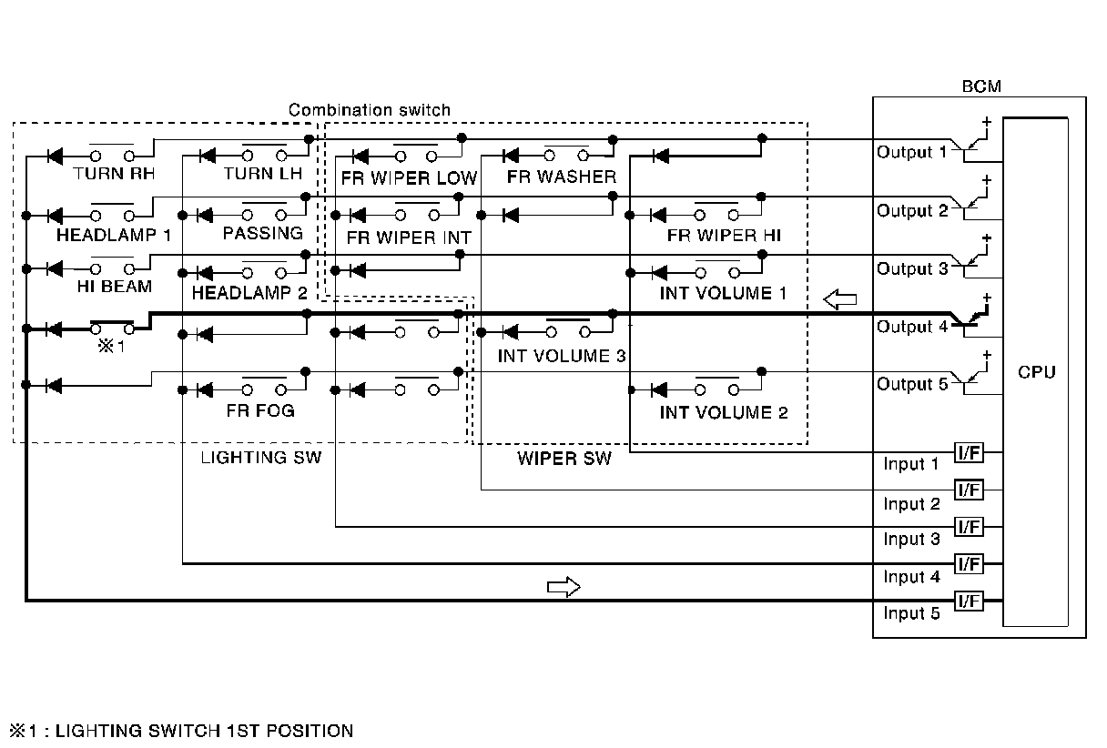 - When OUTPUT 4 transistor is activated again, BCM detects that voltage changes in INPUT 5 and recognizes that lighting switch 1st position is continuously ON.