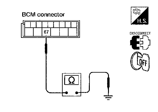 Check continuity between BCM connector M20 terminal 67 and ground.