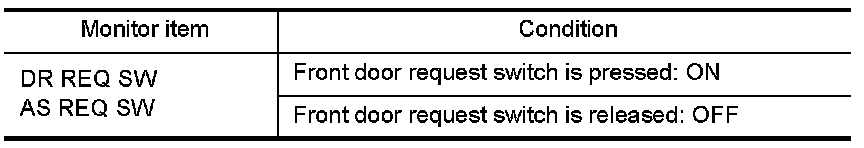 Check front door request switch ("DR REQ SW" or "AS REQ SW") in "DATA MONITOR" mode.