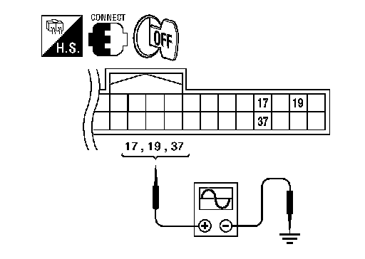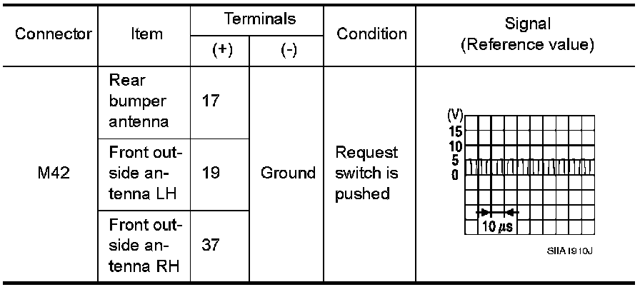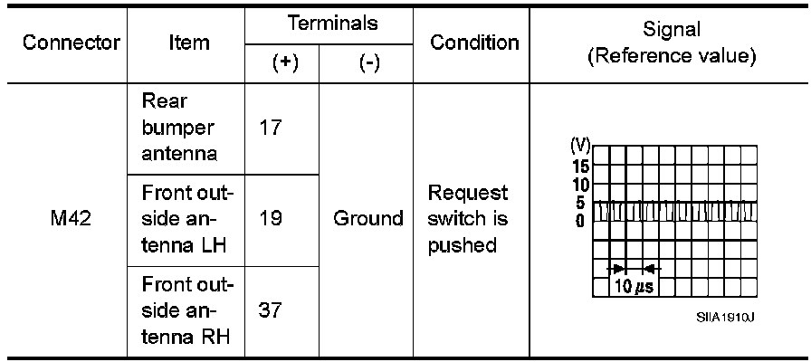 2. Check signal between Intelligent Key unit connector M42 terminals 17, 19, 37 and ground with an oscilloscope.