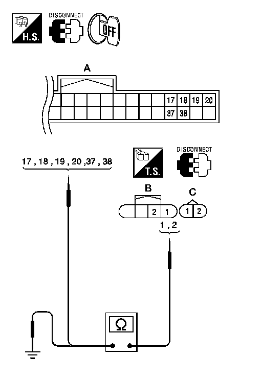 3. Check continuity between each outside key antenna harness connector terminals 1, 2 and ground.
