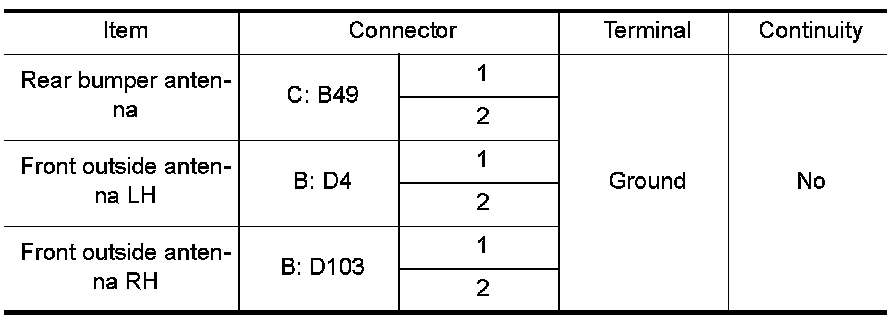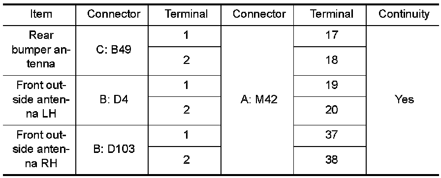 2. Check continuity between each outside key antenna harness connector D4 (B) (LH) or D103 (B) (RH), rear bumper antenna connector B49 (C) terminals 1, 2 and Intelligent Key unit harness connector M42 (A) terminals 17, 18, 19, 20, 37, and 38.