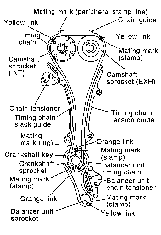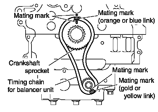 - Install by lining up mating marks on each sprocket and timing chain as shown.