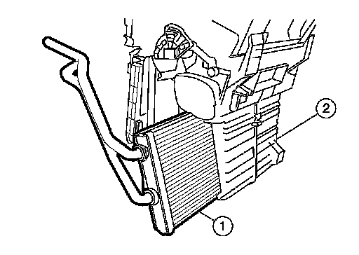 3. Remove the heater core (1) from the heater and cooling unit assembly (2).