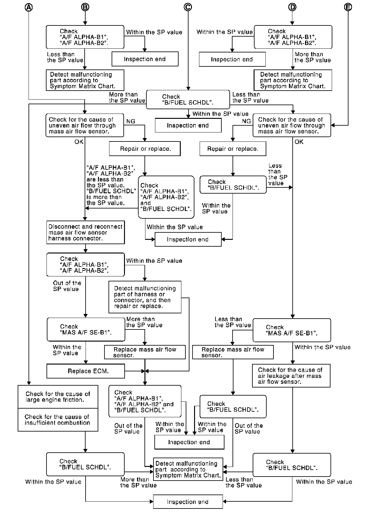 Select "A/F ALPHA-B1", "A/F ALPHA-B2" and "B/FUEL SCHDL" in "SPEC" of "DATA MONITOR" mode, and check that the each indication is within the SP value.