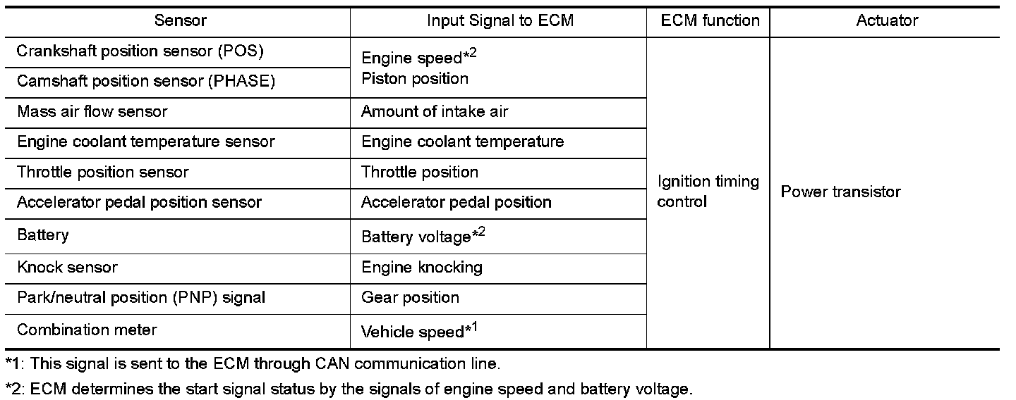 The ECM receives information such as the injection pulse width and camshaft position sensor (PHASE) signal. Computing this information, ignition signals are transmitted to the power transistor.