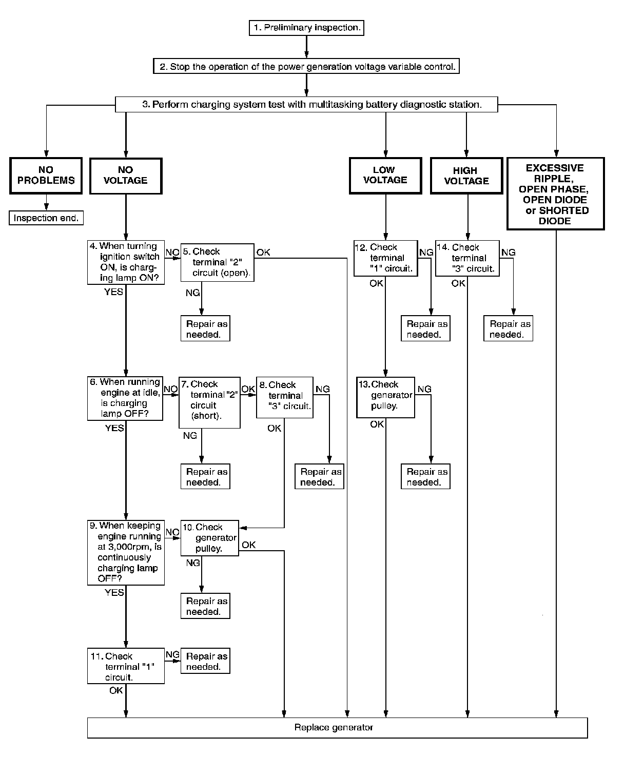 OK - Replace the generator. Service and Repair. Confirm repair by performing complete Starting/Charging system test. Refer to diagnostic station instruction manual.
