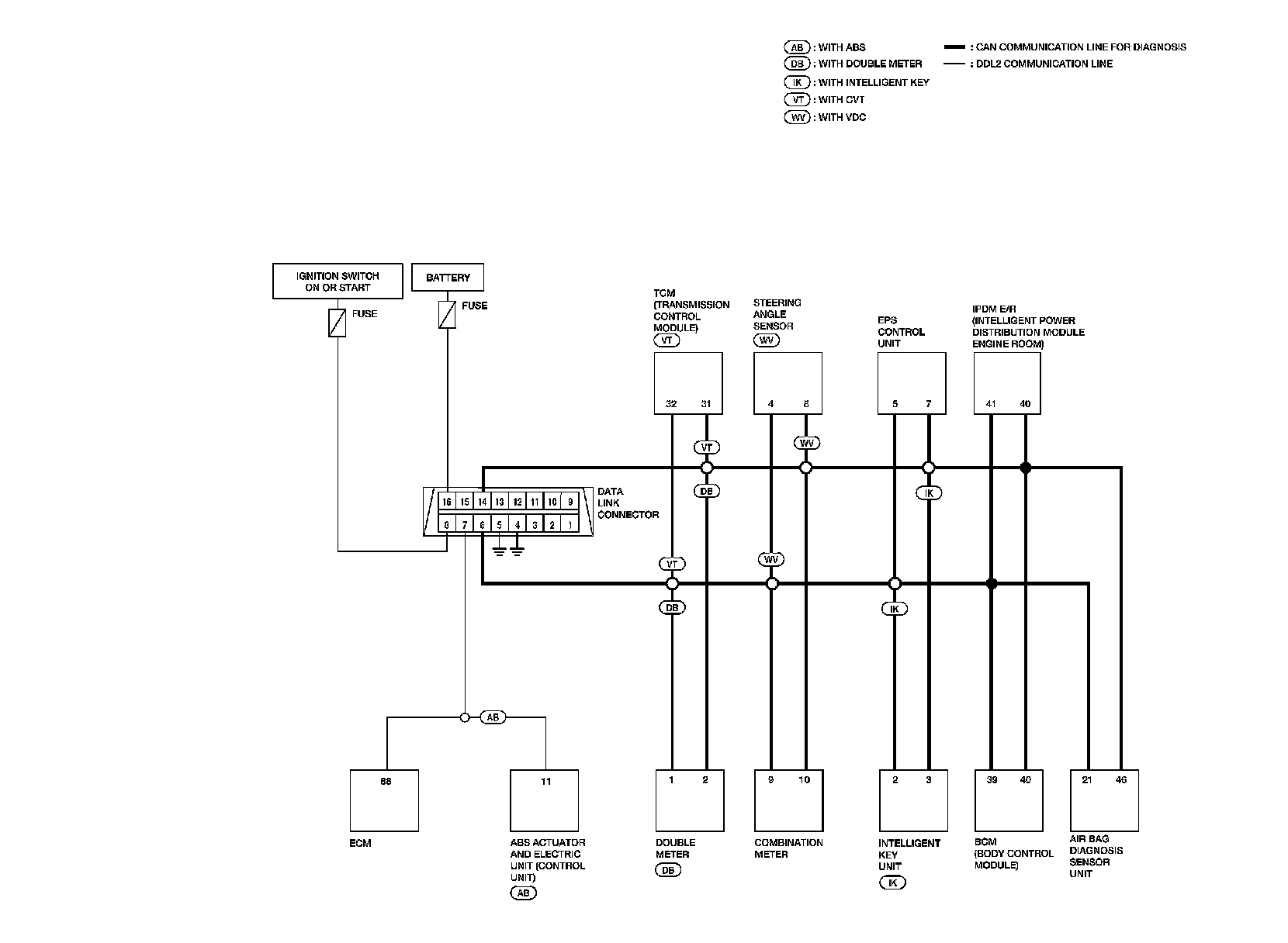 The DDL1 and DDL2 circuits from DLC pins 6, 7 and 14 may be connected to more than one system. A short in a DDL circuit connected to a control unit in one system may affect CONSULT-III access to other systems.