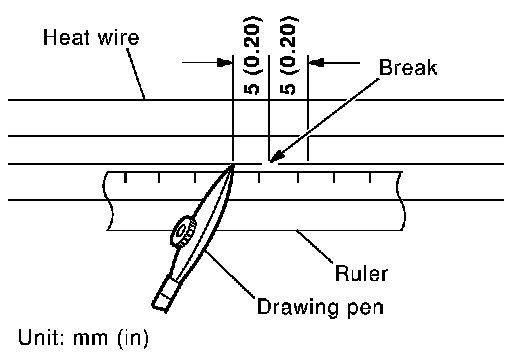 3. Place ruler on glass along broken line. Deposit conductive silver composition on break with drawing pen. Slightly overlap existing heat wire on both sides [preferably 5 mm (0.20 in)] of the break.