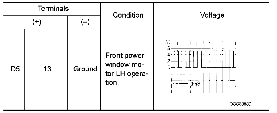 Measure voltage between main power window and door lock/unlock switch connector D5 terminal 13 and ground with oscilloscope when power window is in automatic closing operation.