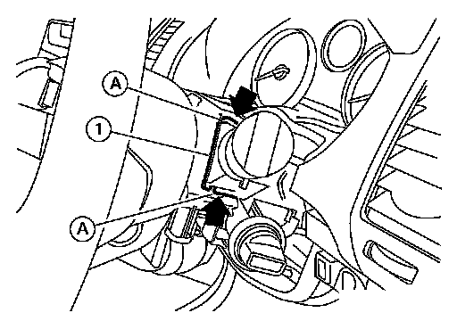 3. Pull wiper and washer switch (1) toward the passenger door while pressing pawls (A) in direction shown by the arrow, and remove it from the base.
